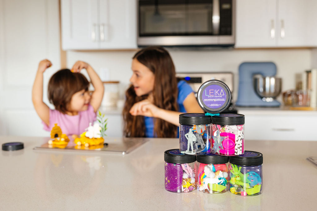 Enjoy our homemade playdough packaged in tightly sealed jars packed with themed loose parts meant to ignite imaginative play at home or on the go!